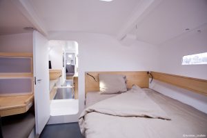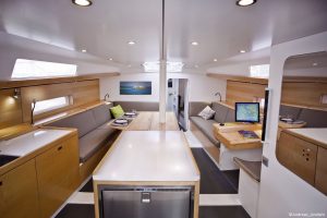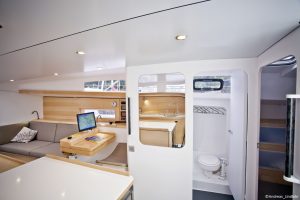 S’il marche vite et bien, le Pogo 50 ne sacrifie pas le confort à la performance. Avec son vaste carré, sa grande cuisine, ses trois cabines et ses deux salles de bains, il assure le standing d’un 50 pieds de croisière moderne, le plaisir de la glisse en plus. La part belle est faite à la lumière et à l’aération, avec de nombreuses ouvertures et un roof à vision frontale. Le Pogo 50, un bateau à vivre, en mer comme au mouillage.